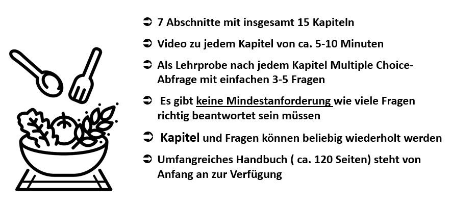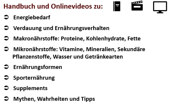 Nach deiner Anmeldung kannst du dir zunächst ein umfangreiches Ernährungshandbuch (ca. 120 Seiten) herunterladen. Anschließend wählst du ganz flexibel, wann du welches der 15 kompakten Videos (je 5–10 Minuten) anschauen möchtest.
