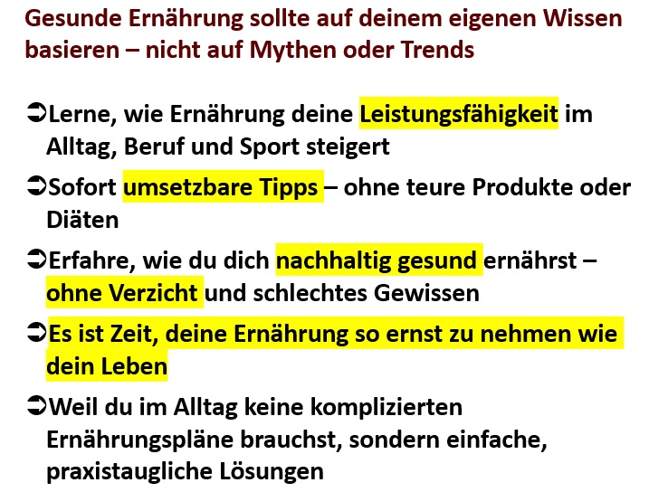 Du lernst in einer klar strukturierten, ruhigen Lernumgebung – ohne Werbung, Sponsoren oder Produktplatzierungen. - Viele sofort umsetzbare Ernährungstipps: